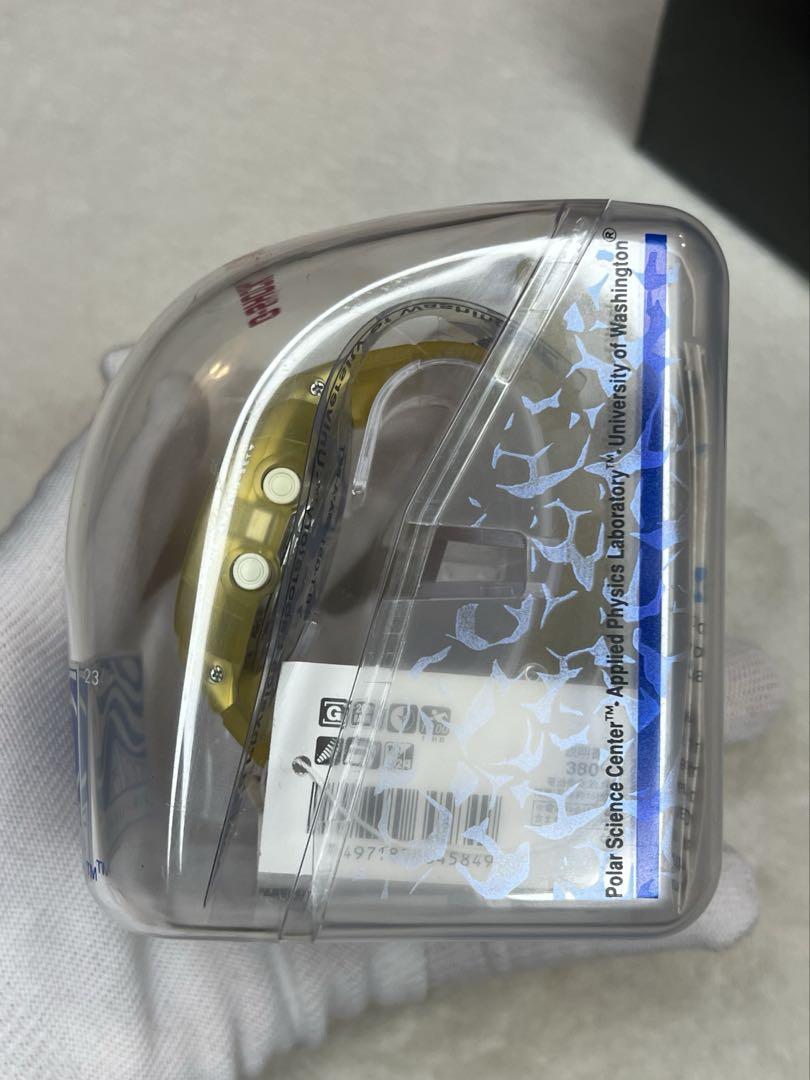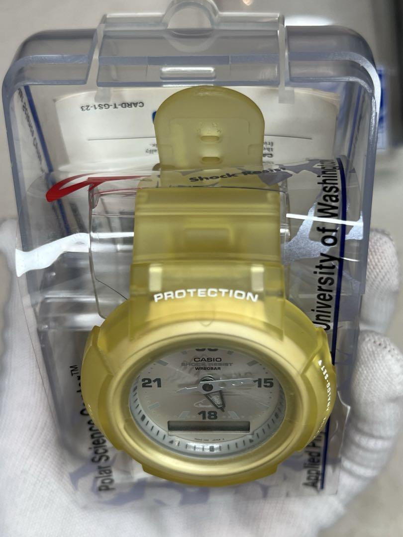 A yellow G-SHOCK with shock resistance and water resistance.