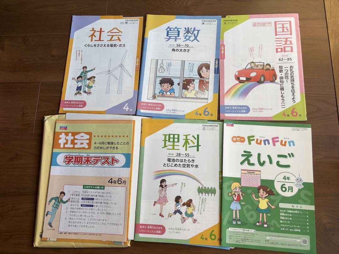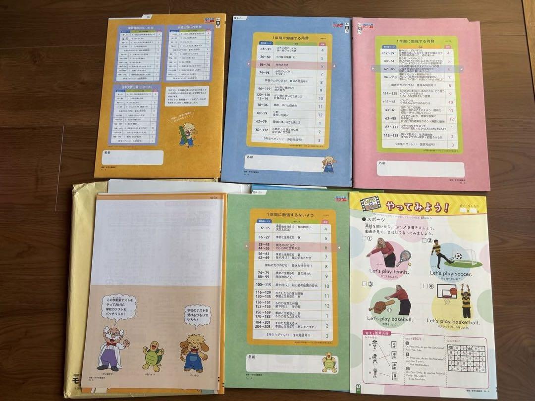 A workbook for 4th graders including Japanese, math, social studies, science, and English.