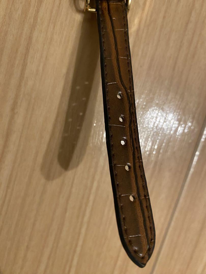 • The strap part is brown leather. The back is a light brown to caramel color with a soft, velvety texture. I ordered a custom-made strap that matches the watch face's atmosphere at a watch shop, as the original strap looked cheap. It has 5 adjustment holes and is free of creases and scratches on both sides.