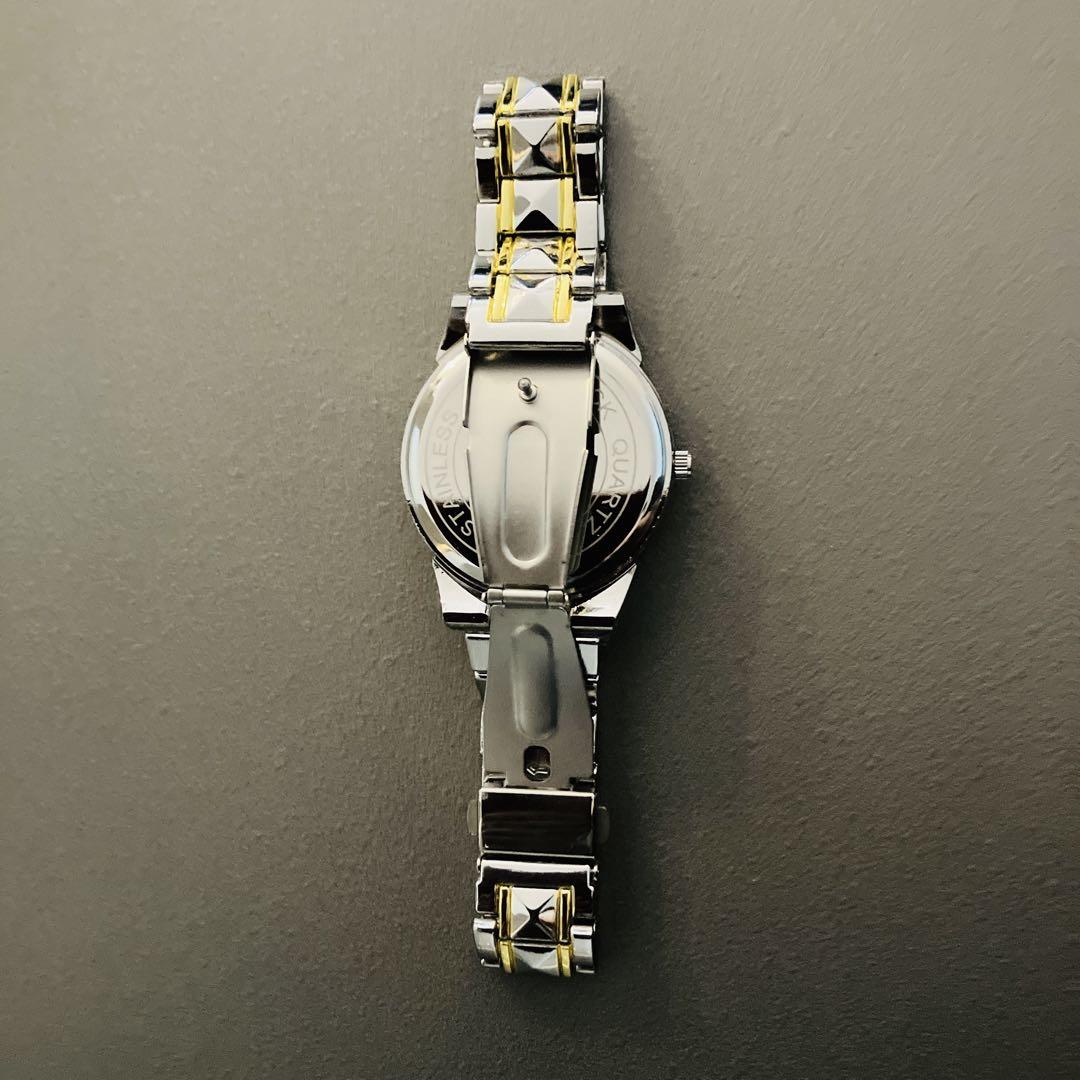 Stylish silver and gold octagonal case, quartz watch with date display.